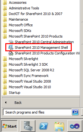 First, launch the SharePoint 2010 Command Shell (do not just run PowerShell – although you can do this you have to manually import the SharePoint cmdlets. If you receive the cmdlets not found issue then you have to modify your access to the SharePoint_Config database.